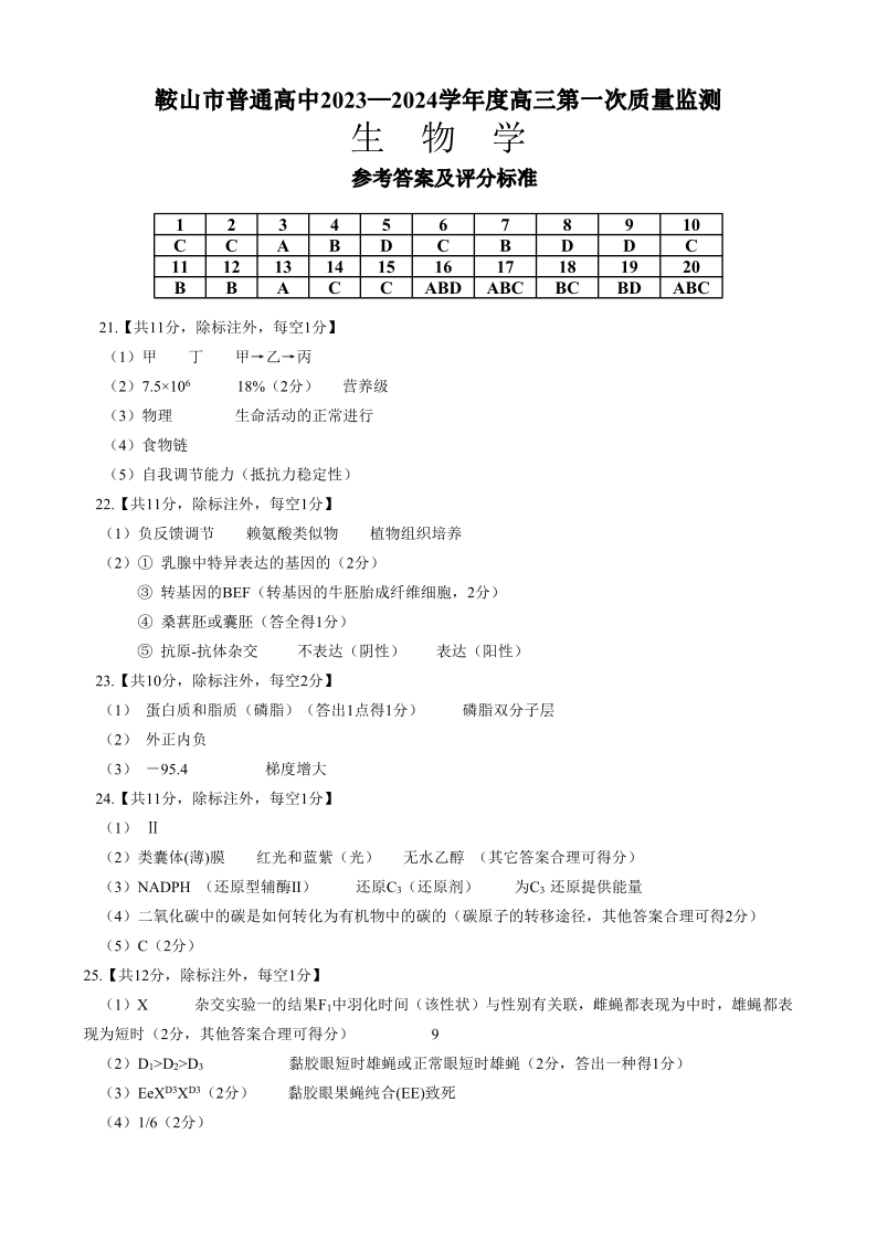 辽宁省鞍山市2023-2024学年高三上学期第一次质量监测 生物答案