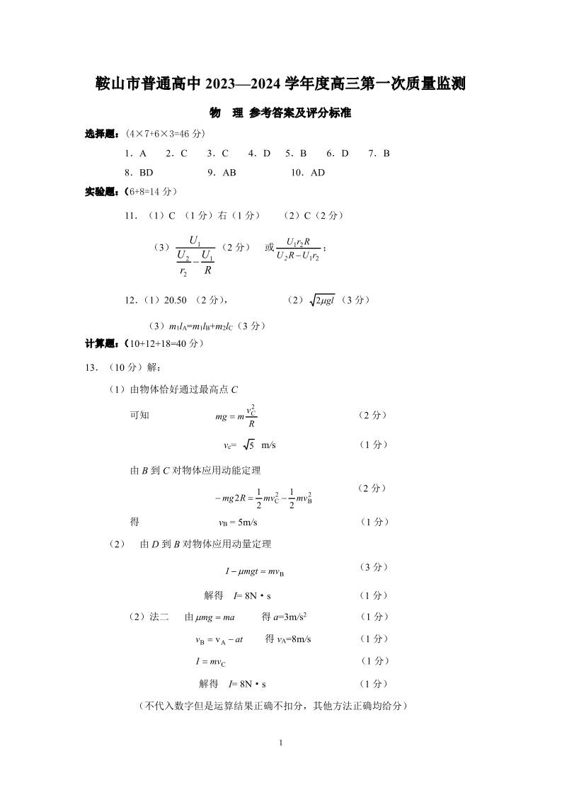 辽宁省鞍山市2023-2024学年高三上学期第一次质量监测 物理答案