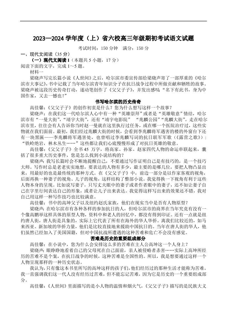 辽宁省六校2023-2024学年高三上学期期初考试 语文