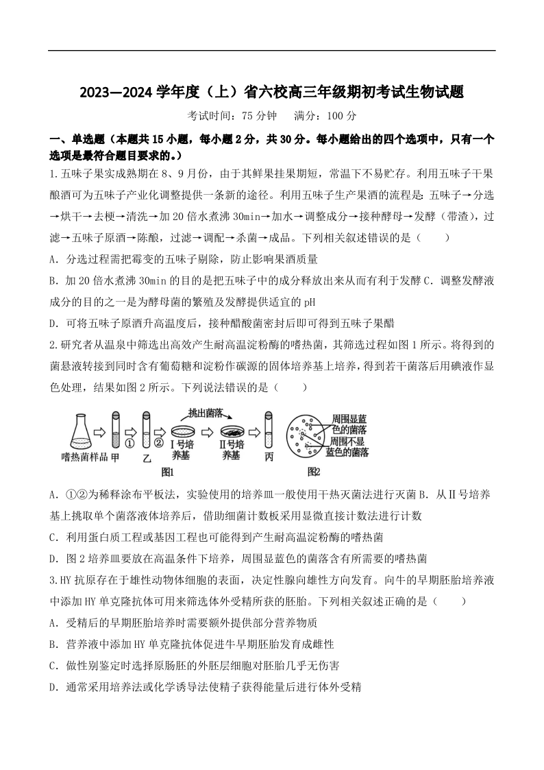 辽宁省六校2023-2024学年高三上学期期初考试 生物