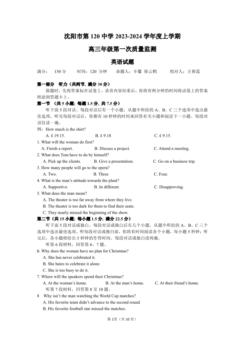 辽宁省沈阳市第一二〇中学2023-2024学年高三上学期第一次质量检测 英语