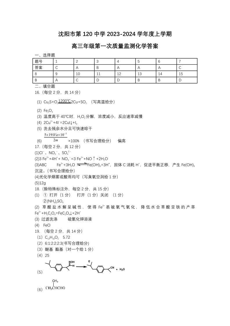 辽宁省沈阳市第一二〇中学2023-2024学年高三上学期第一次质量检测 化学答案