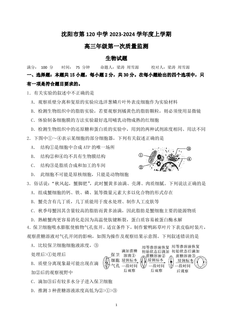 辽宁省沈阳市第一二〇中学2023-2024学年高三上学期第一次质量检测 生物