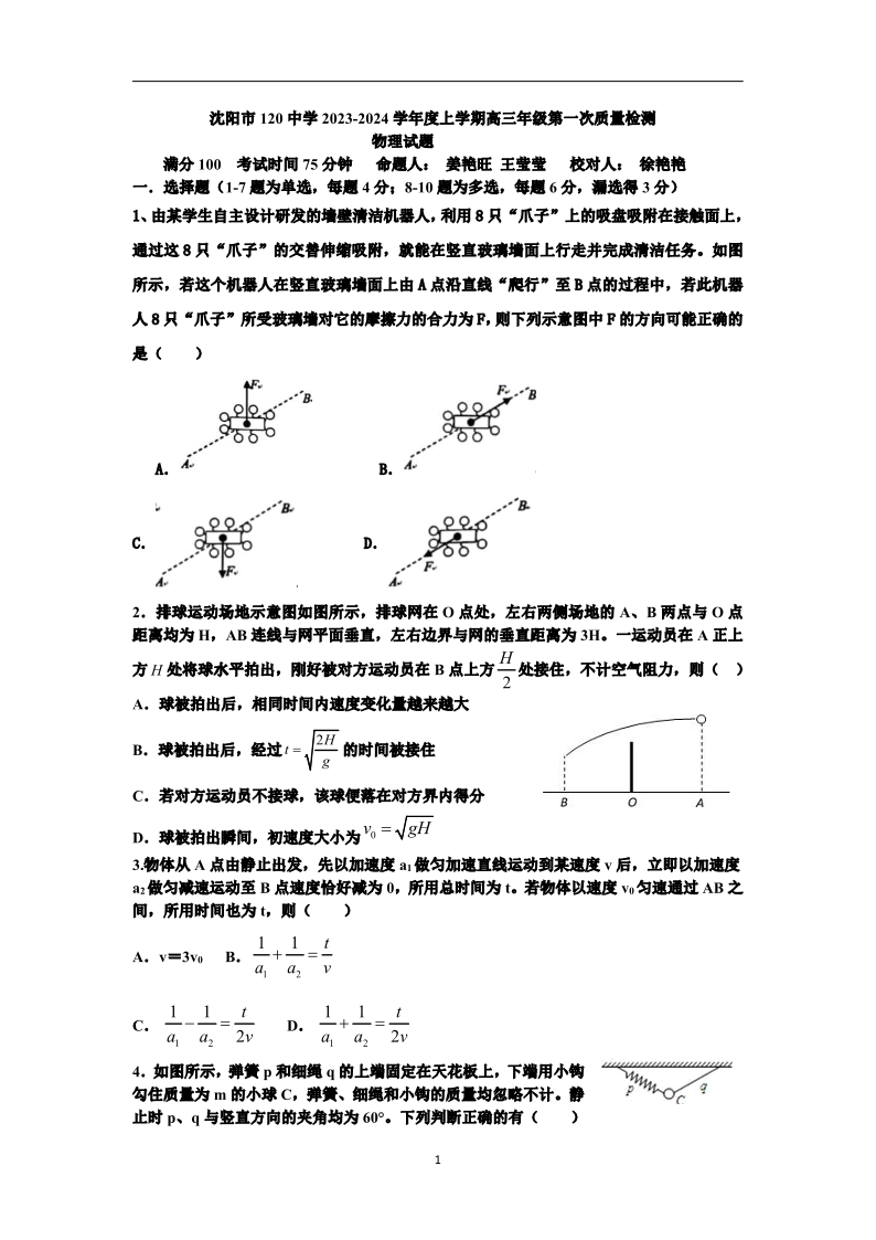 辽宁省沈阳市第一二〇中学2023-2024学年高三上学期第一次质量检测 物理