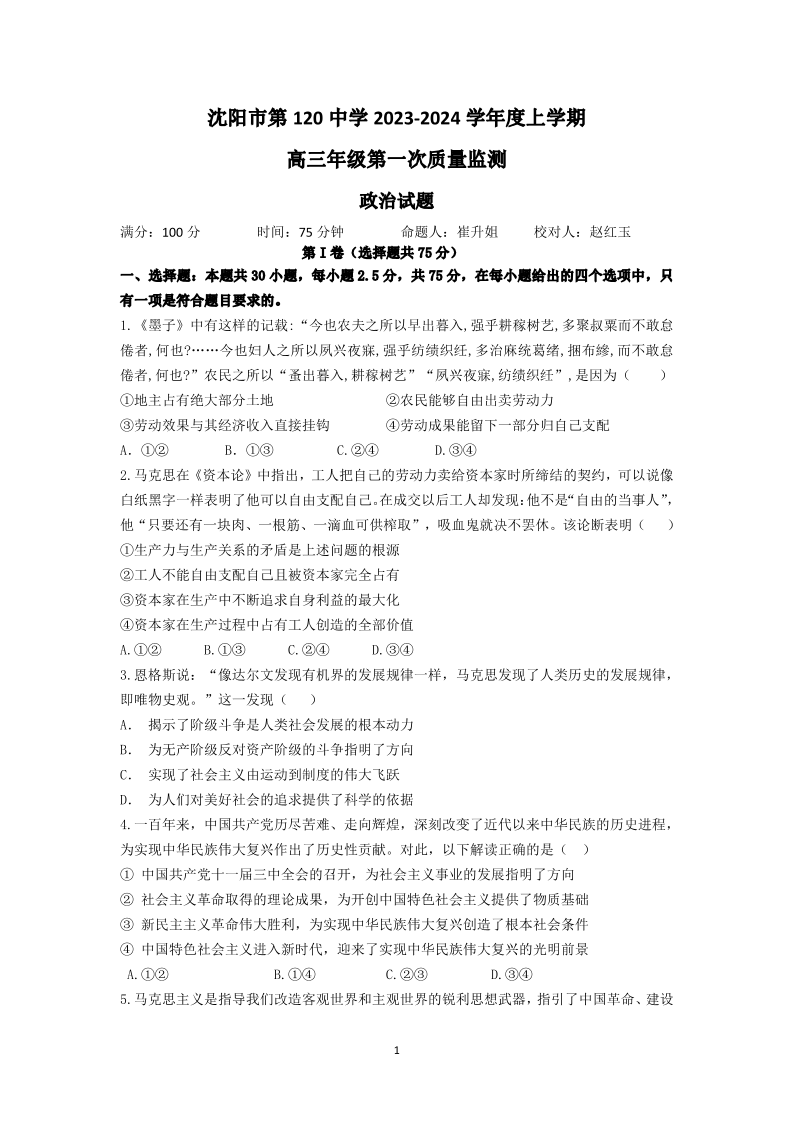 辽宁省沈阳市第一二〇中学2023-2024学年高三上学期第一次质量检测 政治