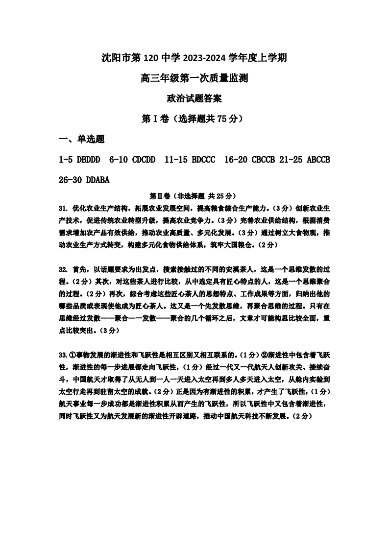 辽宁省沈阳市第一二〇中学2023-2024学年高三上学期第一次质量检测 政治答案