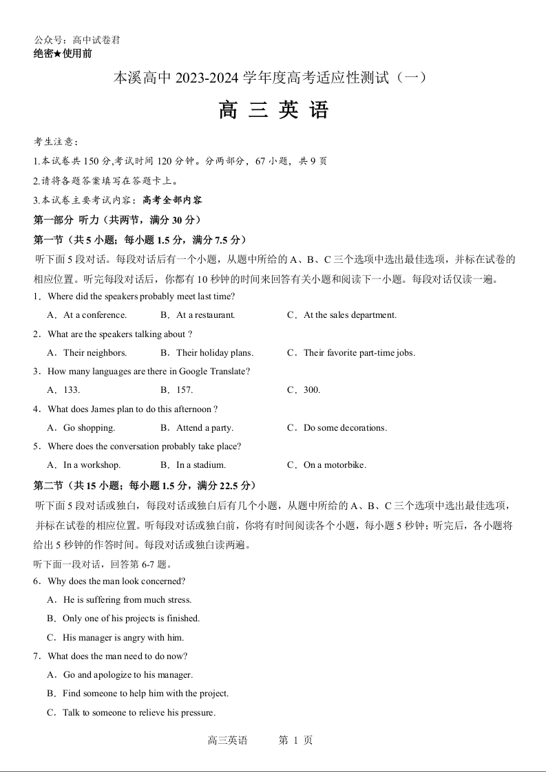 本溪高中2023-2024学年度高考适应性测试(一)英语试题