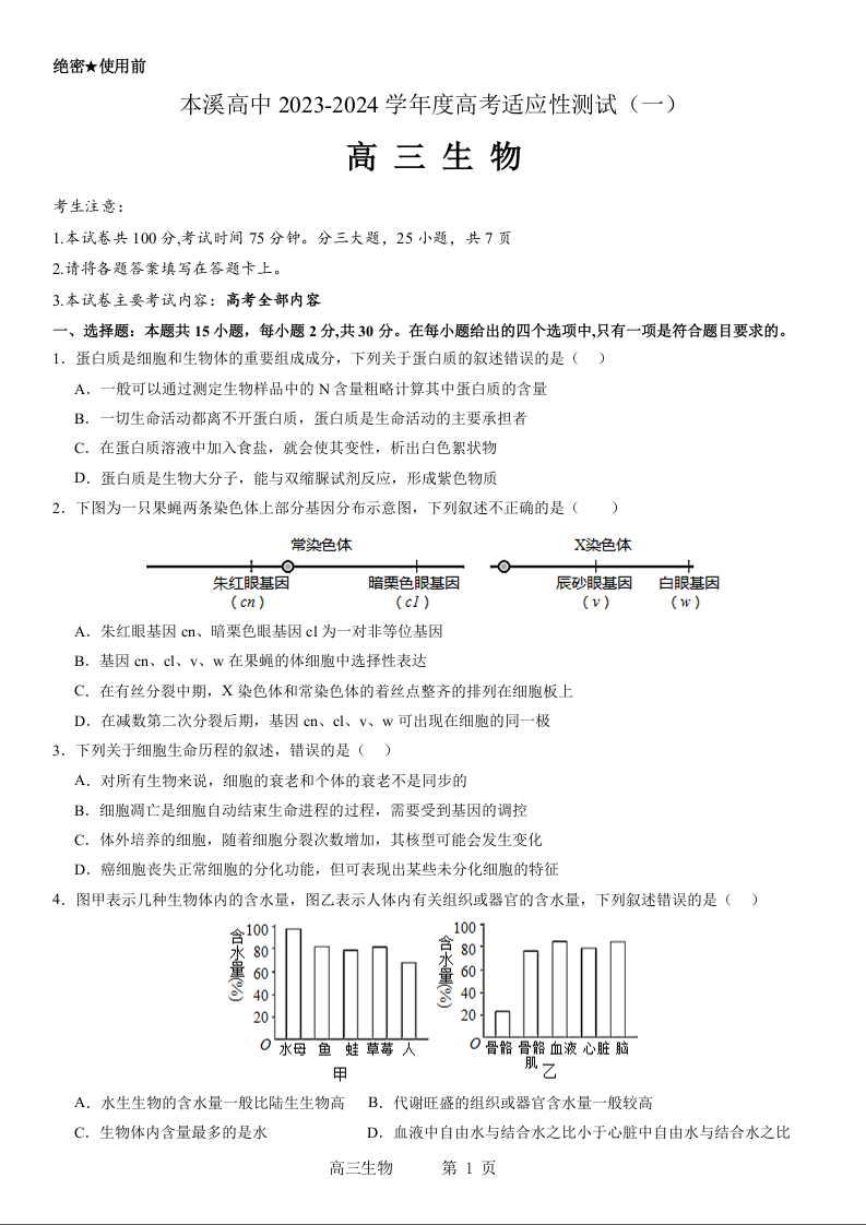 本溪高中2023-2024学年度高考适应性测试(一)生物试题