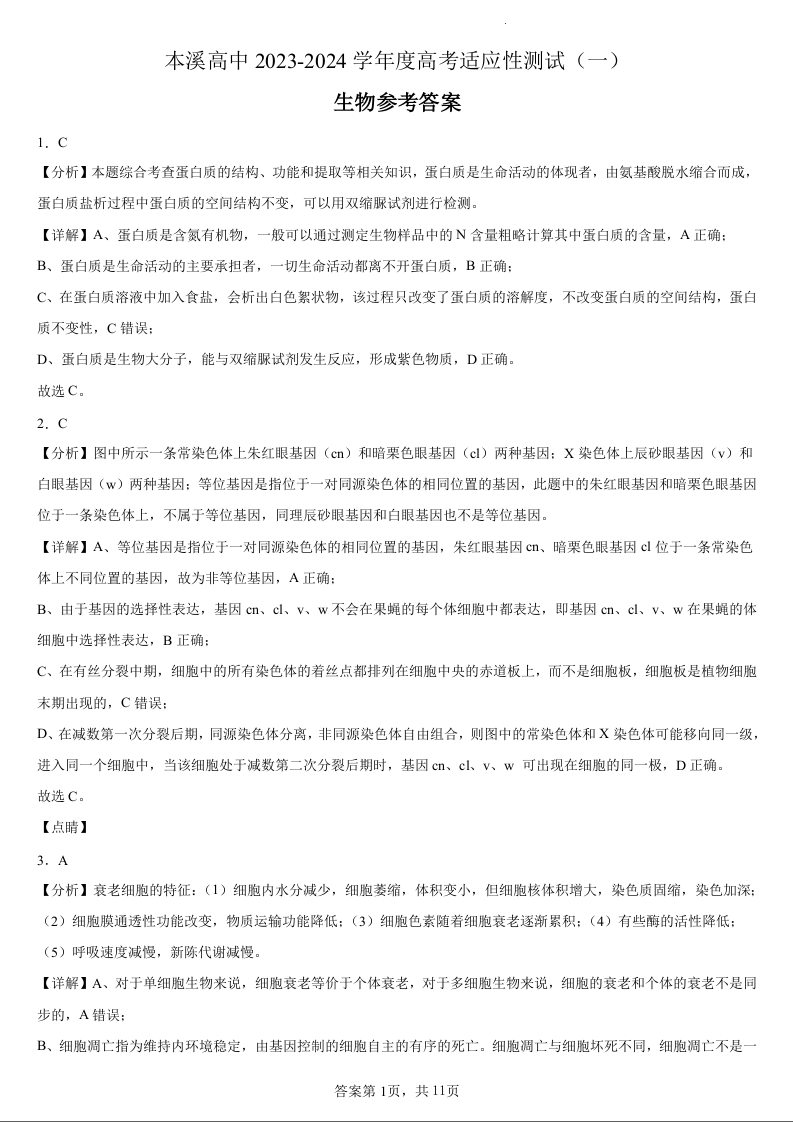 本溪高中2023-2024学年度高考适应性测试(一)生物参考答案