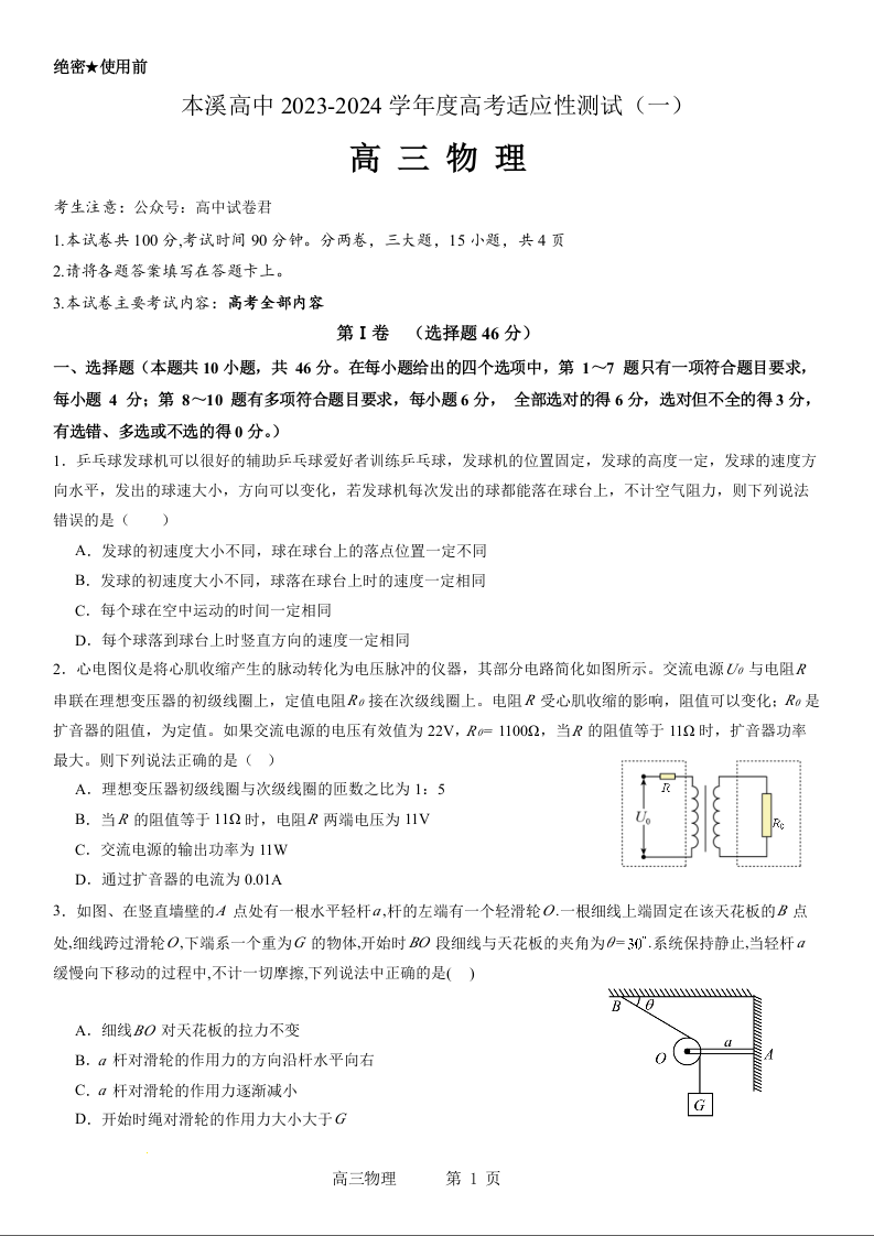 本溪高中2023-2024学年度高考适应性测试(一)物理试题