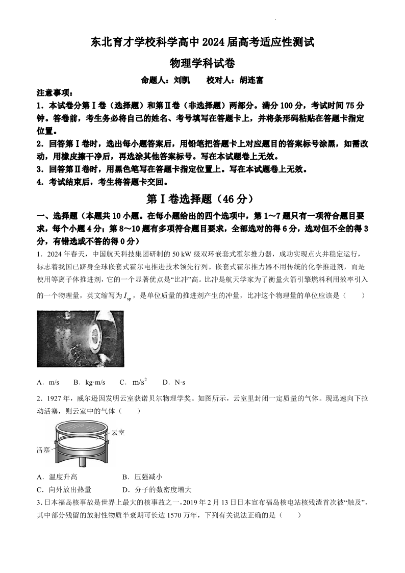 2024届辽宁省东北育才学校科学高中部高三下学期适应性测试+物理