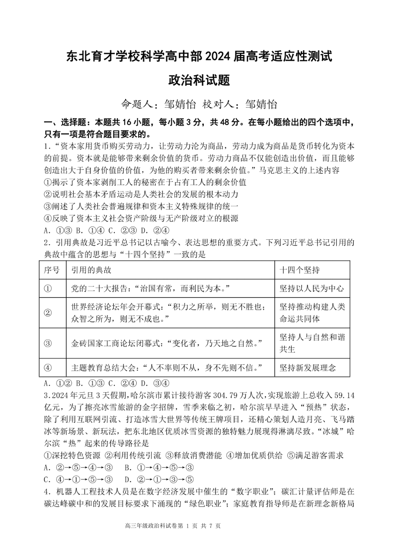 2024届辽宁省东北育才学校科学高中部高三下学期适应性测试+政治