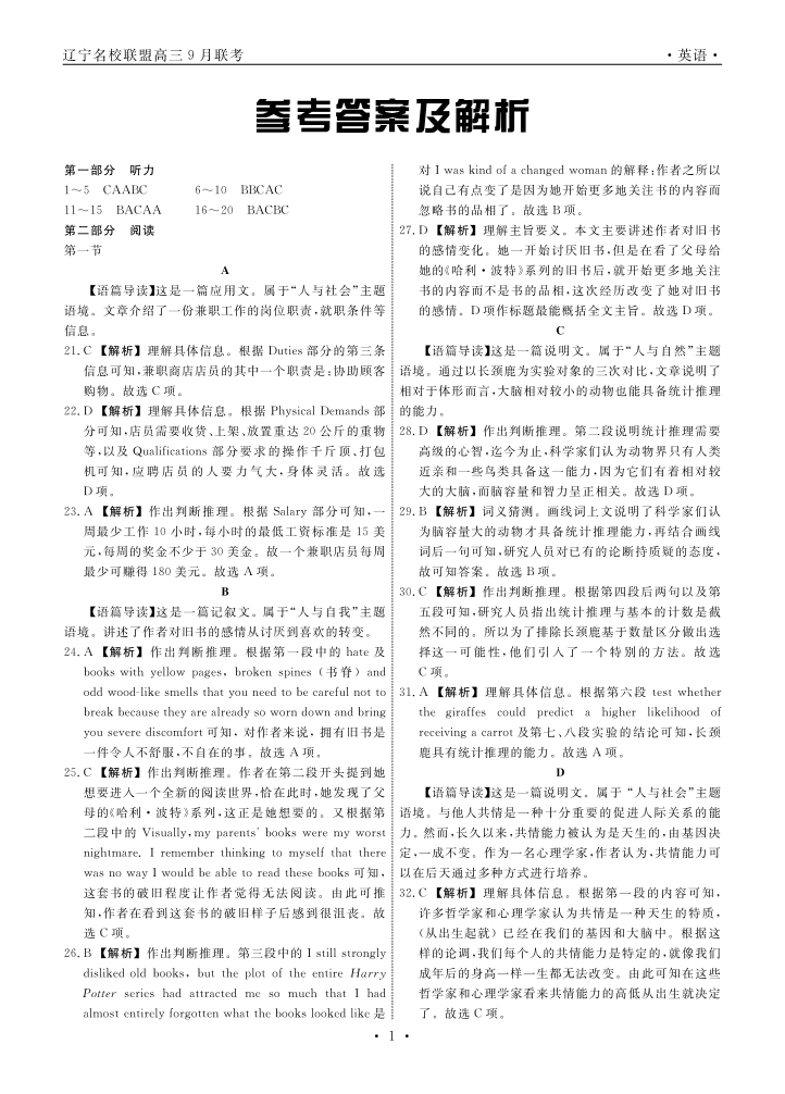 辽宁省名校联盟2024年高三9月份联合考试+英语答案
