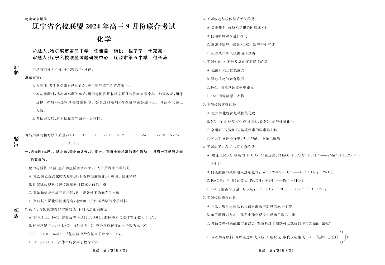 辽宁省名校联盟2024年高三9月份联合考试+化学