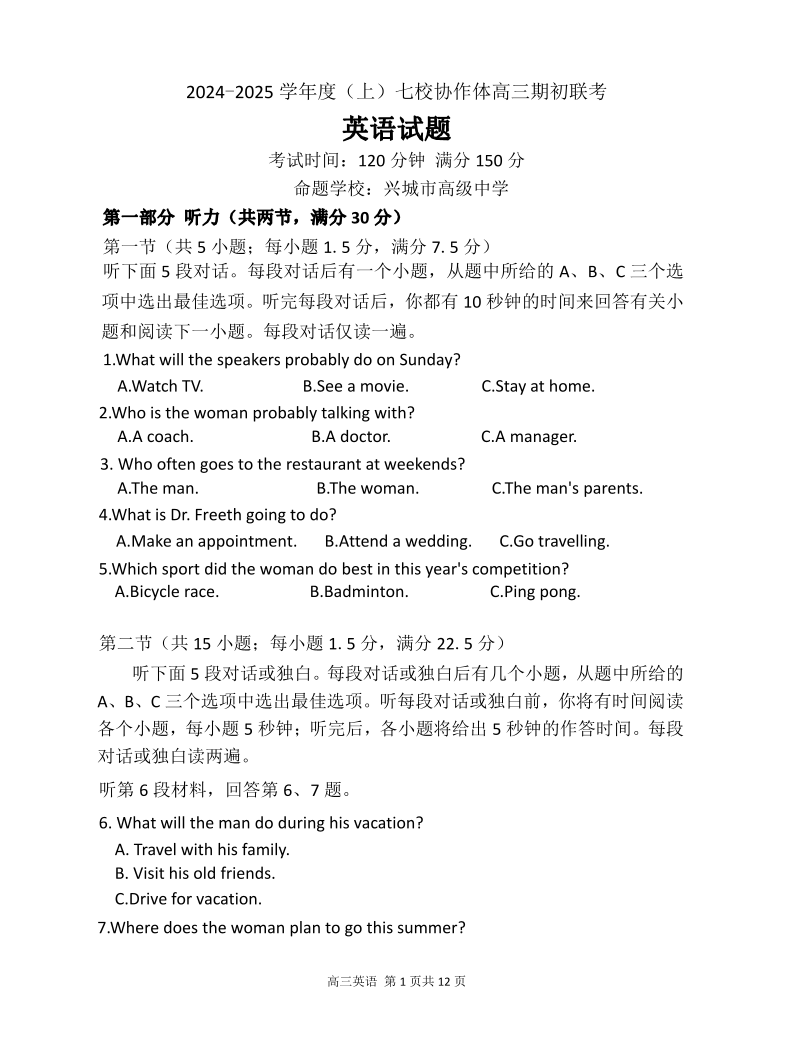 辽宁省2024-2025学年度(上)七校协作体高三期初联考+英语