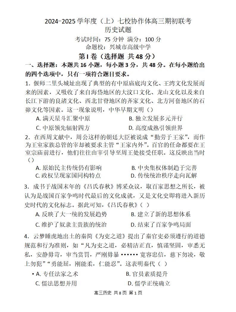 辽宁省2024-2025学年度(上)七校协作体高三期初联考+历史