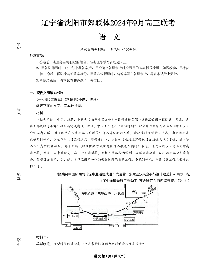 辽宁省沈阳市郊联体2024年9月新高三9月开学联考+语文