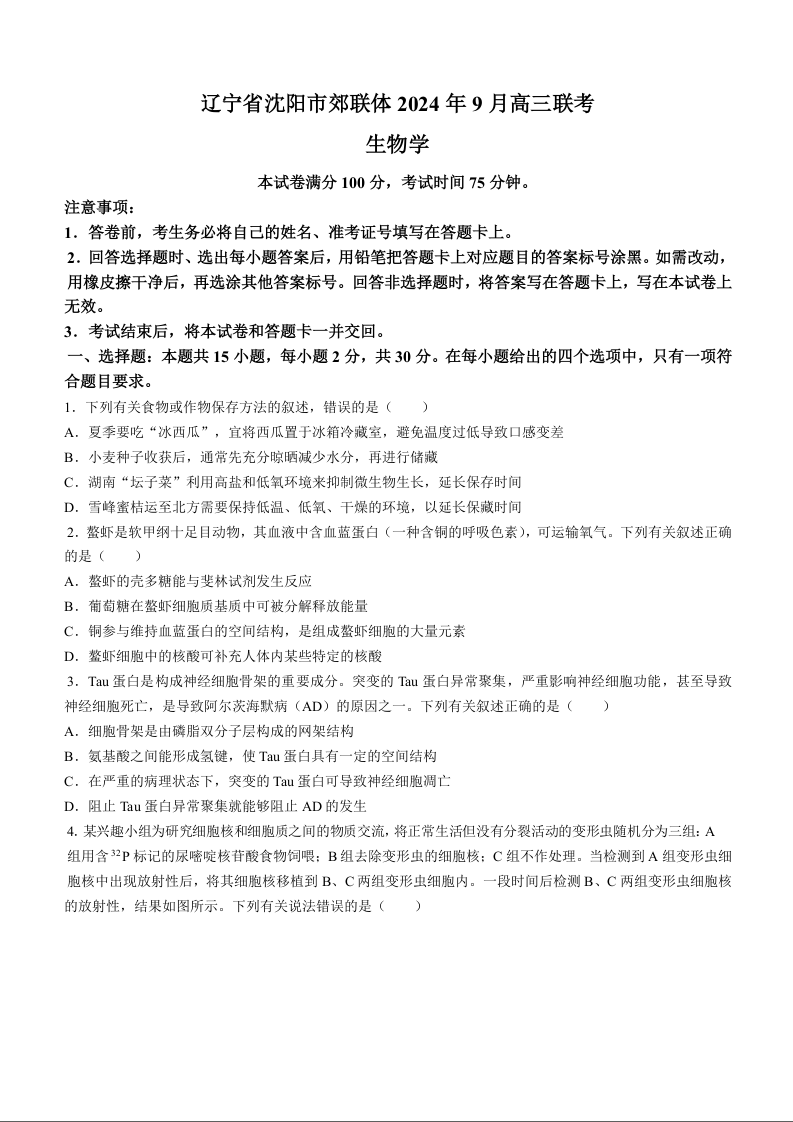 辽宁省沈阳市郊联体2024年9月新高三9月开学联考+生物