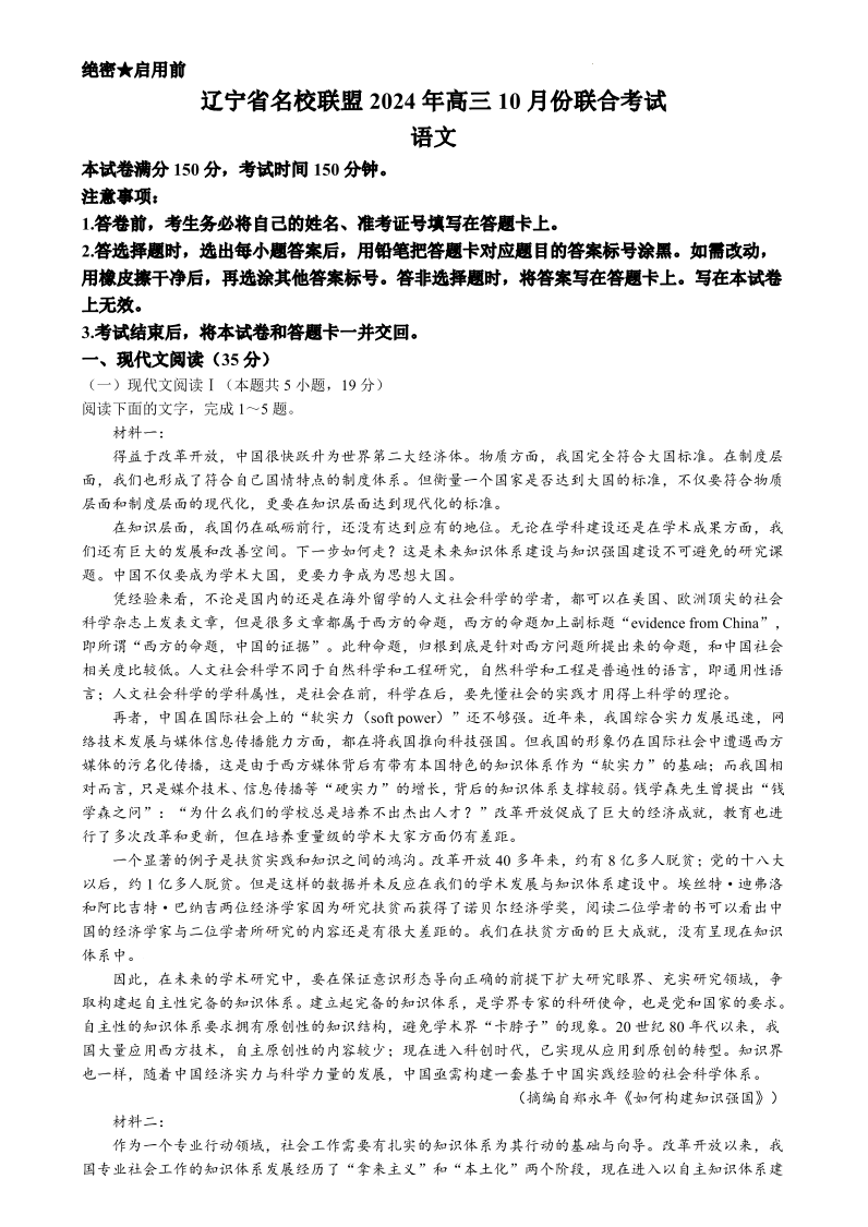 辽宁省名校联盟2024年高三10月份联合考试+语文