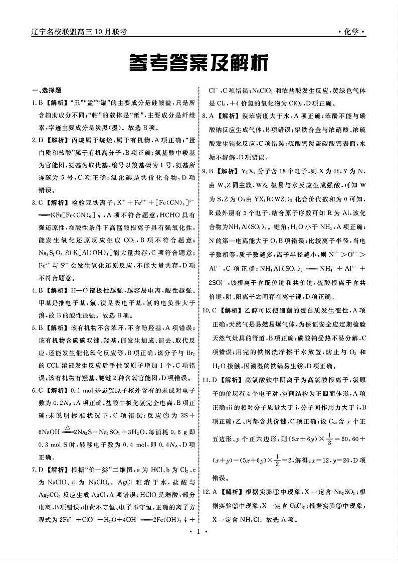 辽宁省名校联盟2024年高三10月份联合考试+化学答案