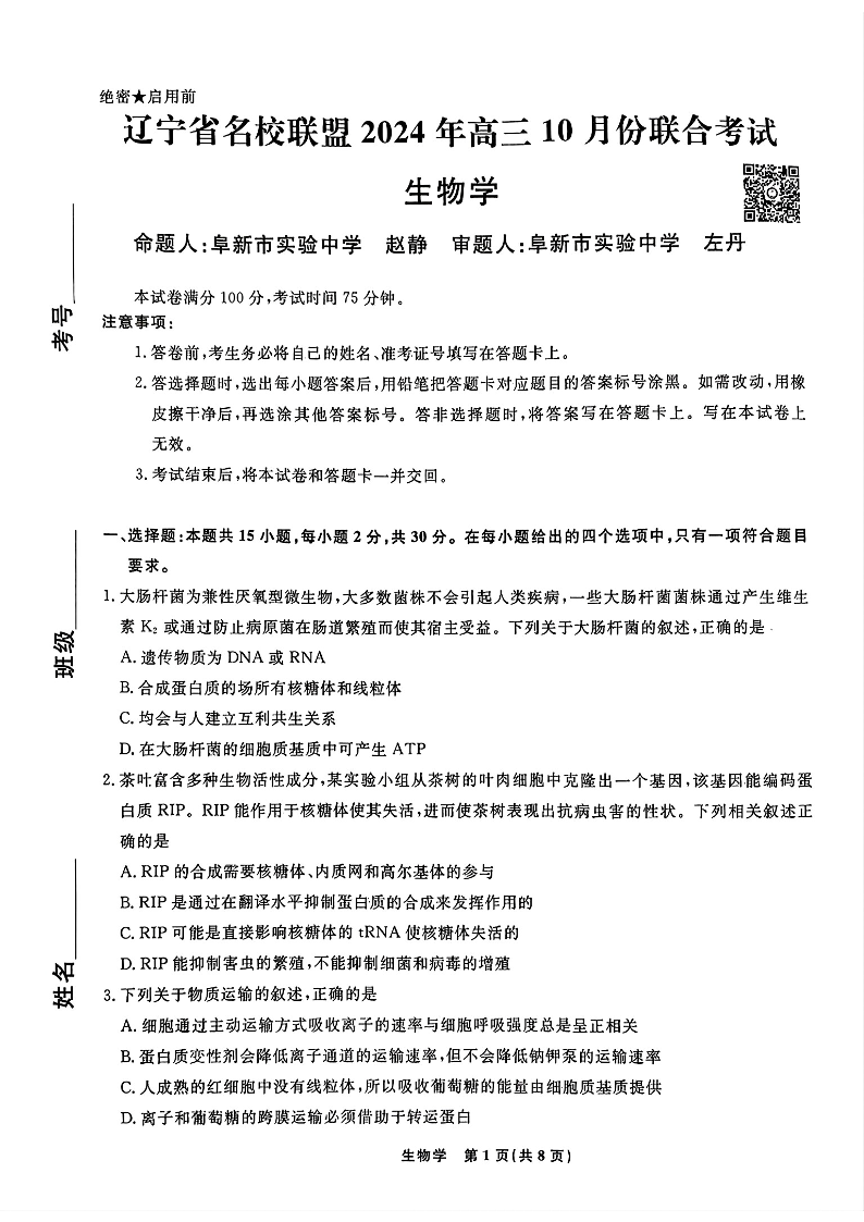 辽宁省名校联盟2024年高三10月份联合考试+生物