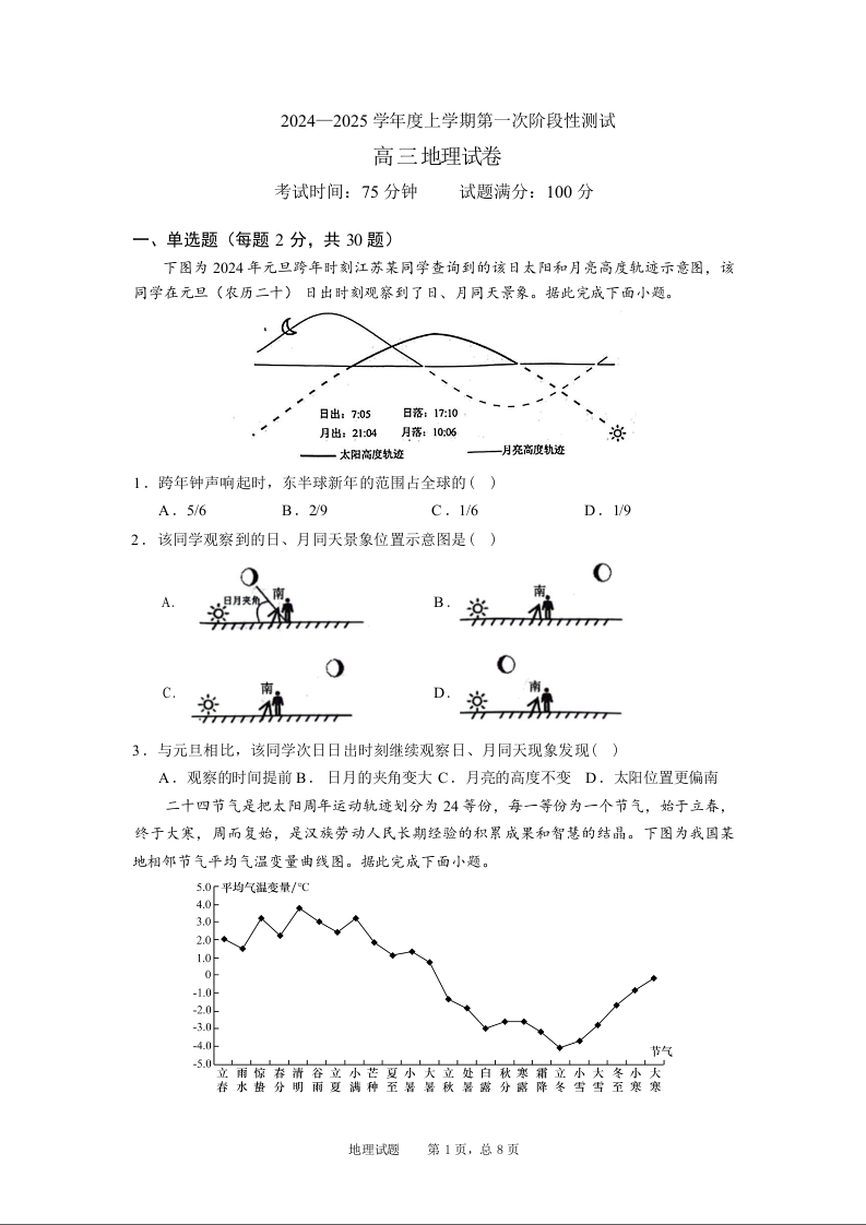 辽宁省实验中学2025届高三上学期第一次月考+地理