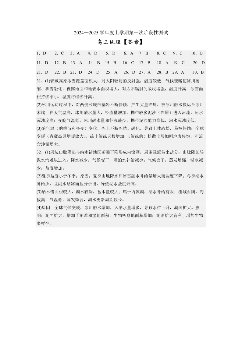 辽宁省实验中学2025届高三上学期第一次月考+地理答案