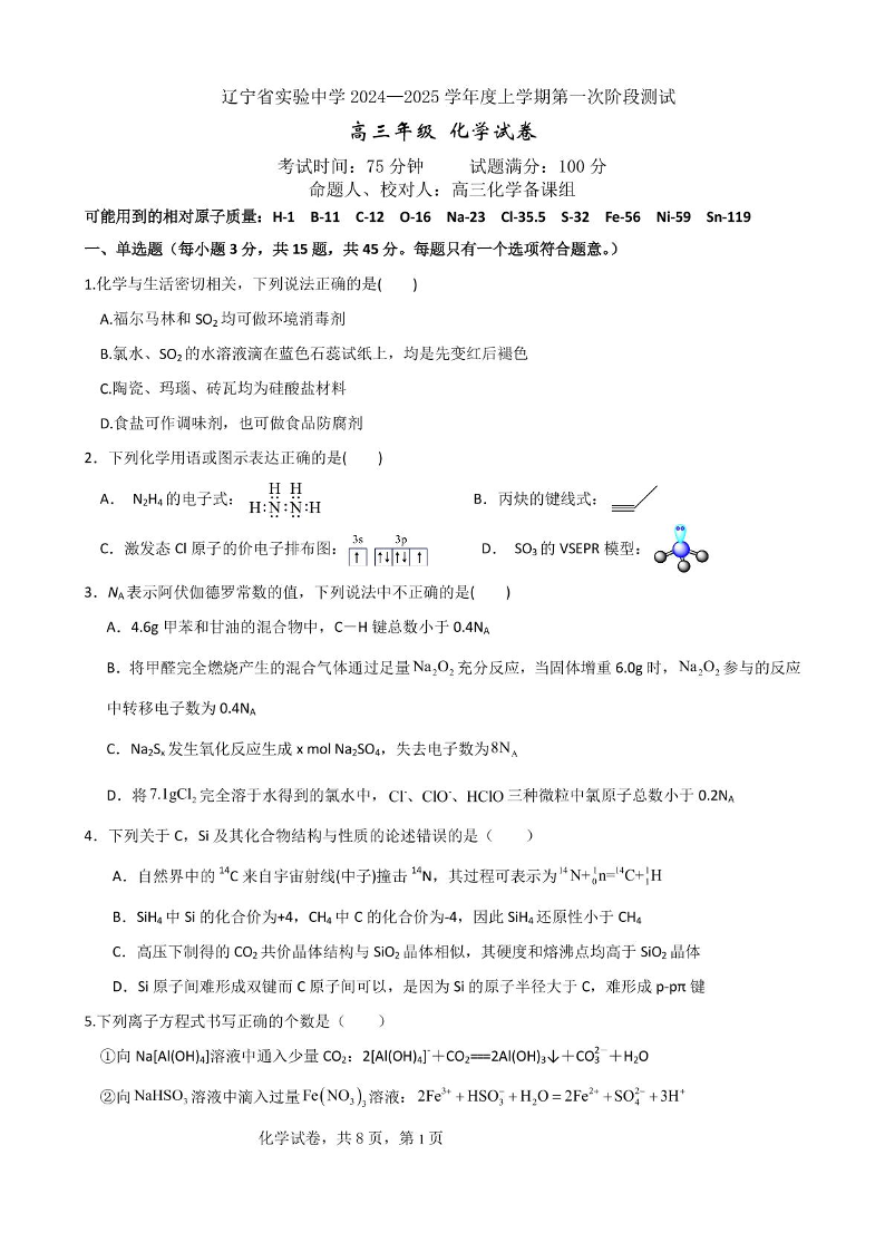 辽宁省实验中学2025届高三上学期第一次月考+化学