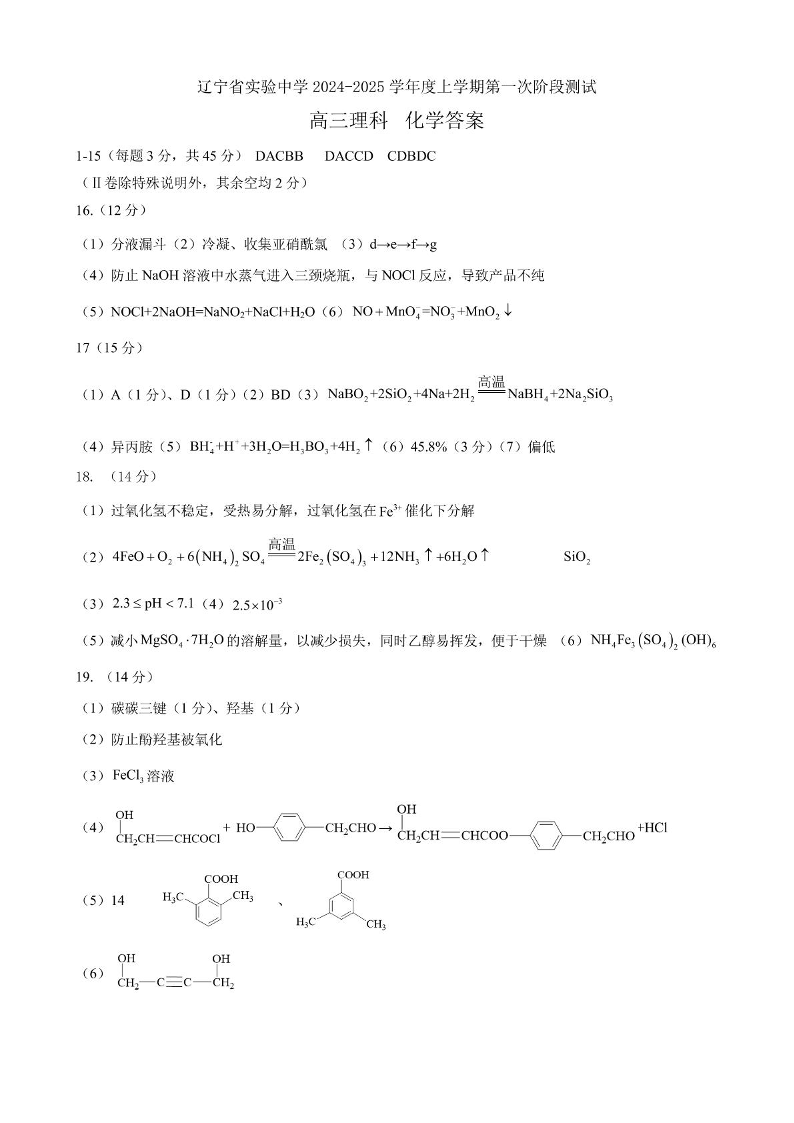 辽宁省实验中学2025届高三上学期第一次月考+化学答案