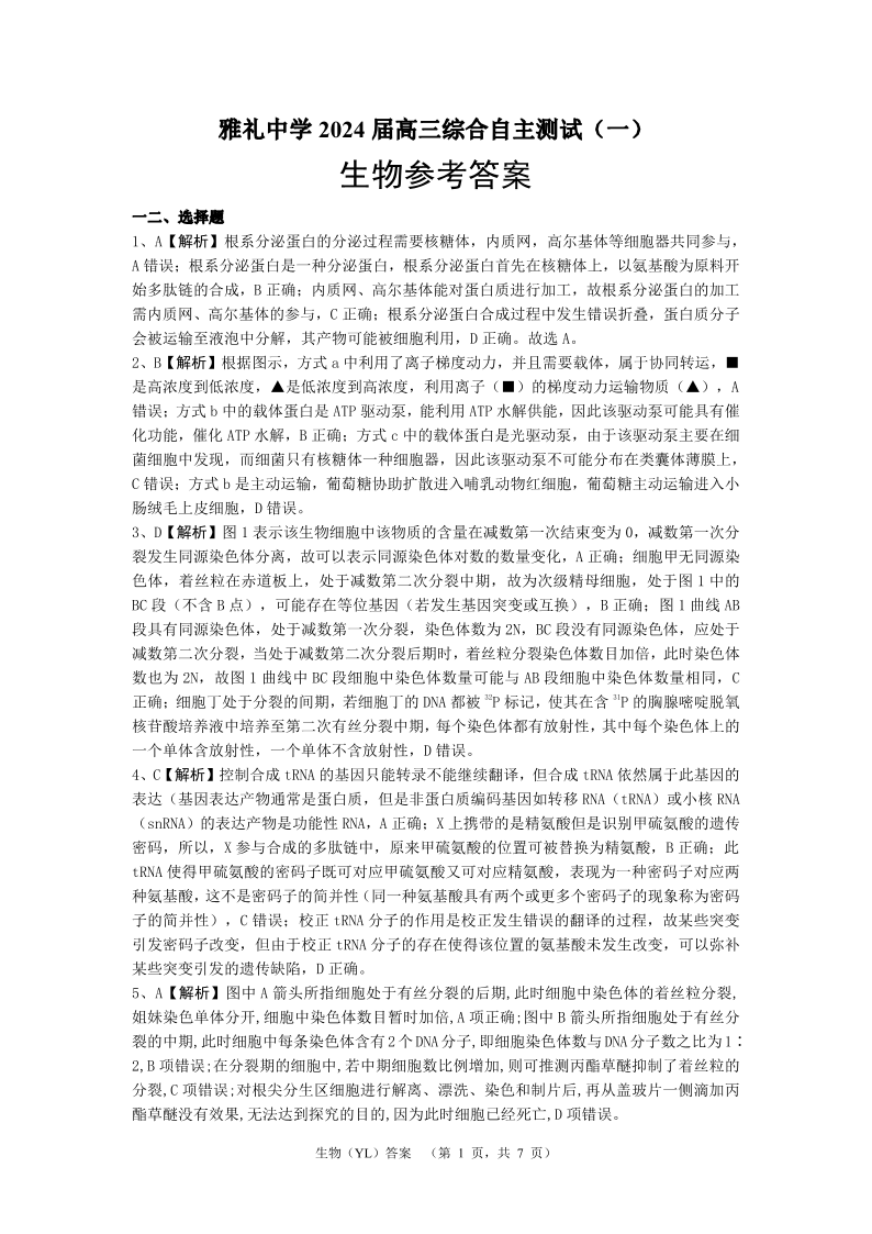湖南省长沙市雅礼中学2024届高三下学期3月综合测试(一)生物答案