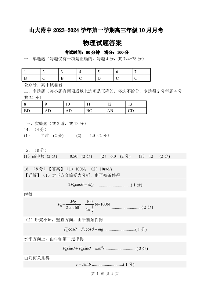 山西大学附属中学2023-2024学年高三上学期10月月考 物理答案