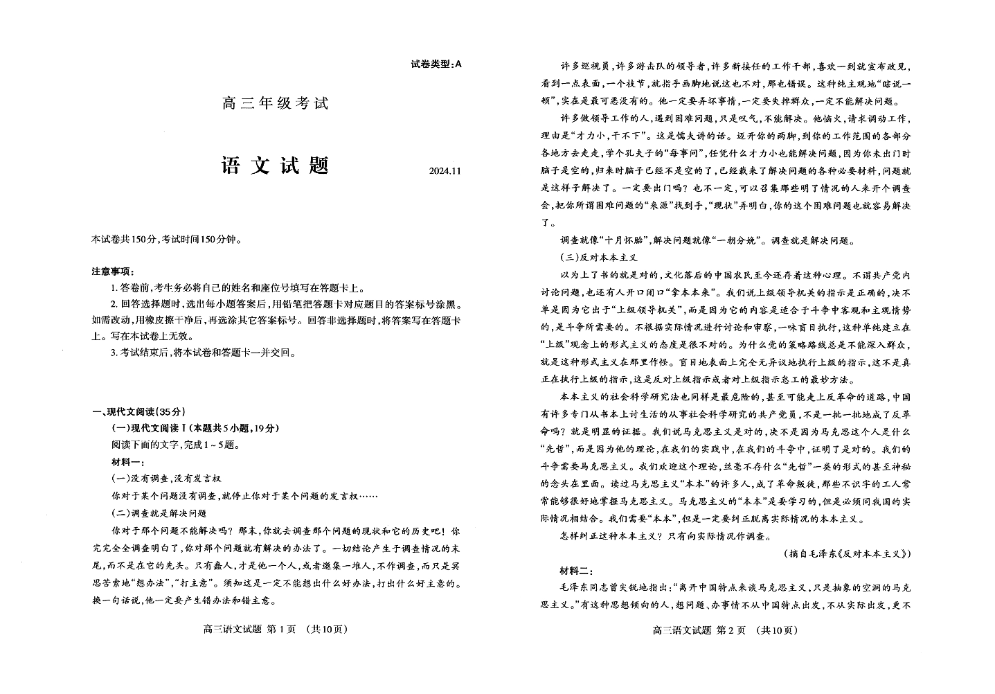 山东省泰安市2024.11高三年级期中考试语文