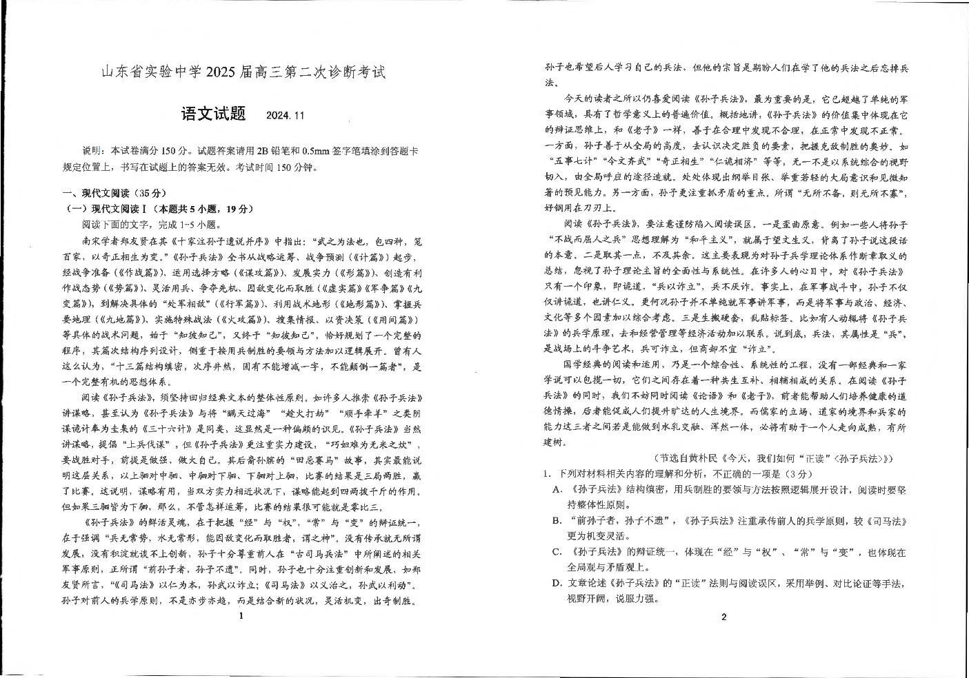 山东省实验中学2024.11高三年级第二次诊断考试语文