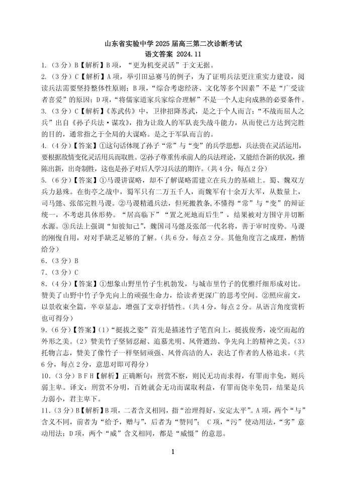 山东省实验中学2024.11高三年级第二次诊断考试语文答案