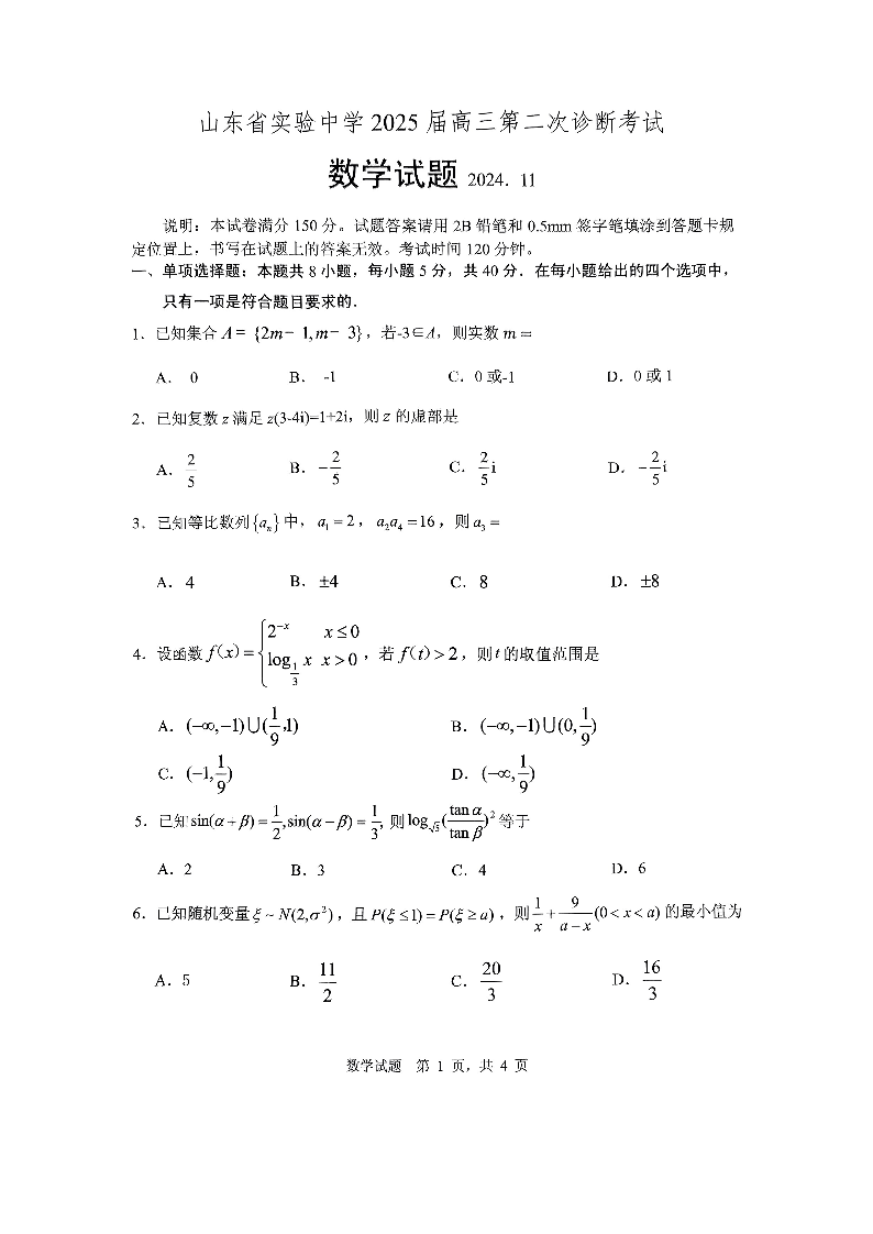 山东省实验中学2024.11高三年级第二次诊断考试数学