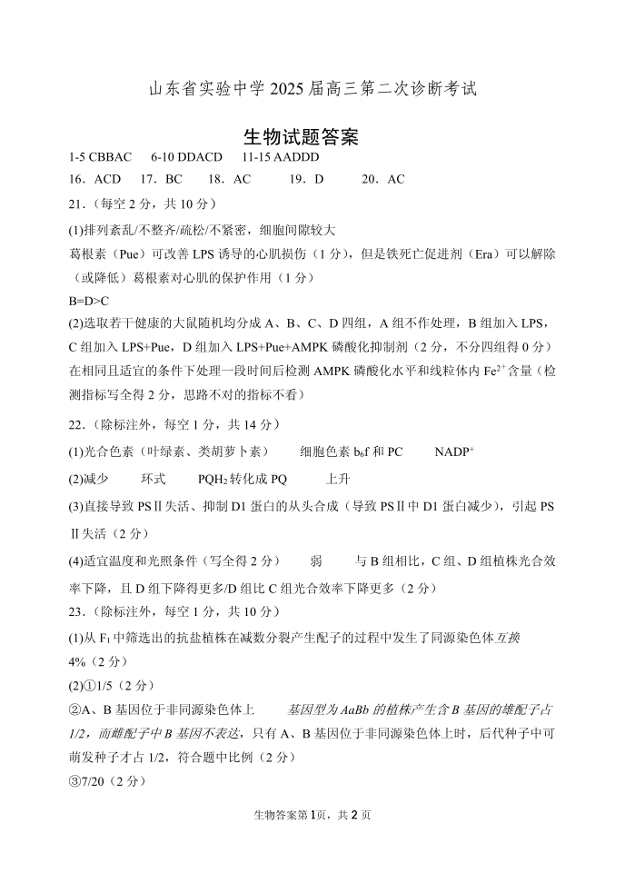 山东省实验中学2024.11高三年级第二次诊断考试生物答案