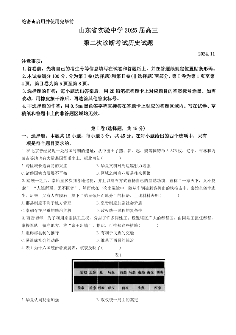 山东省实验中学2024.11高三年级第二次诊断考试历史+答案