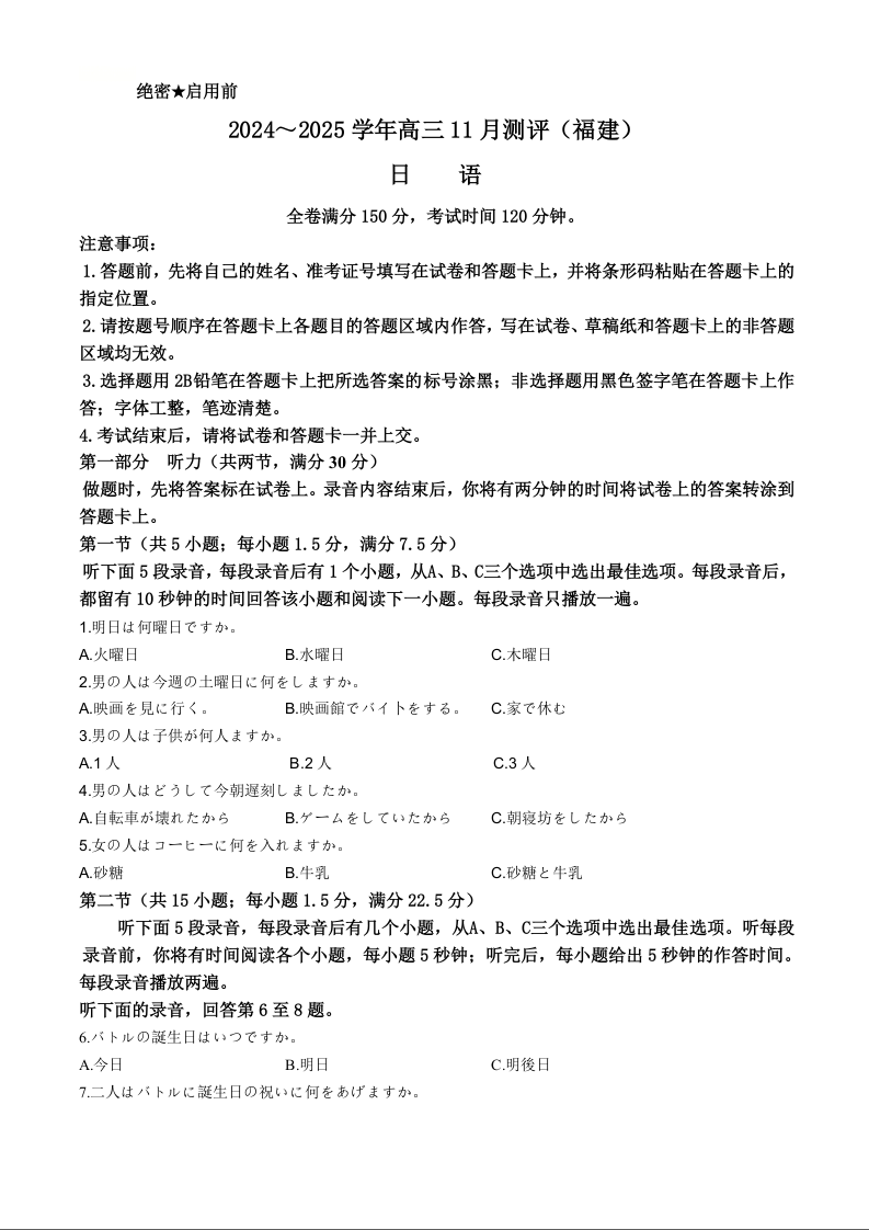 福建省2024-2025学年金科大联考高三11月测评化学日语试题及答案