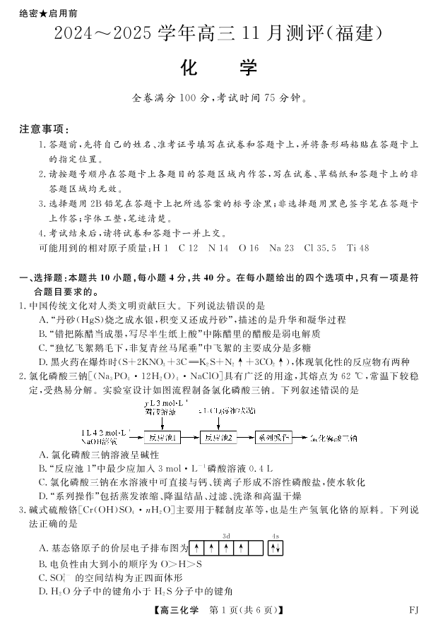 福建省2024-2025学年金科大联考高三11月测评化学