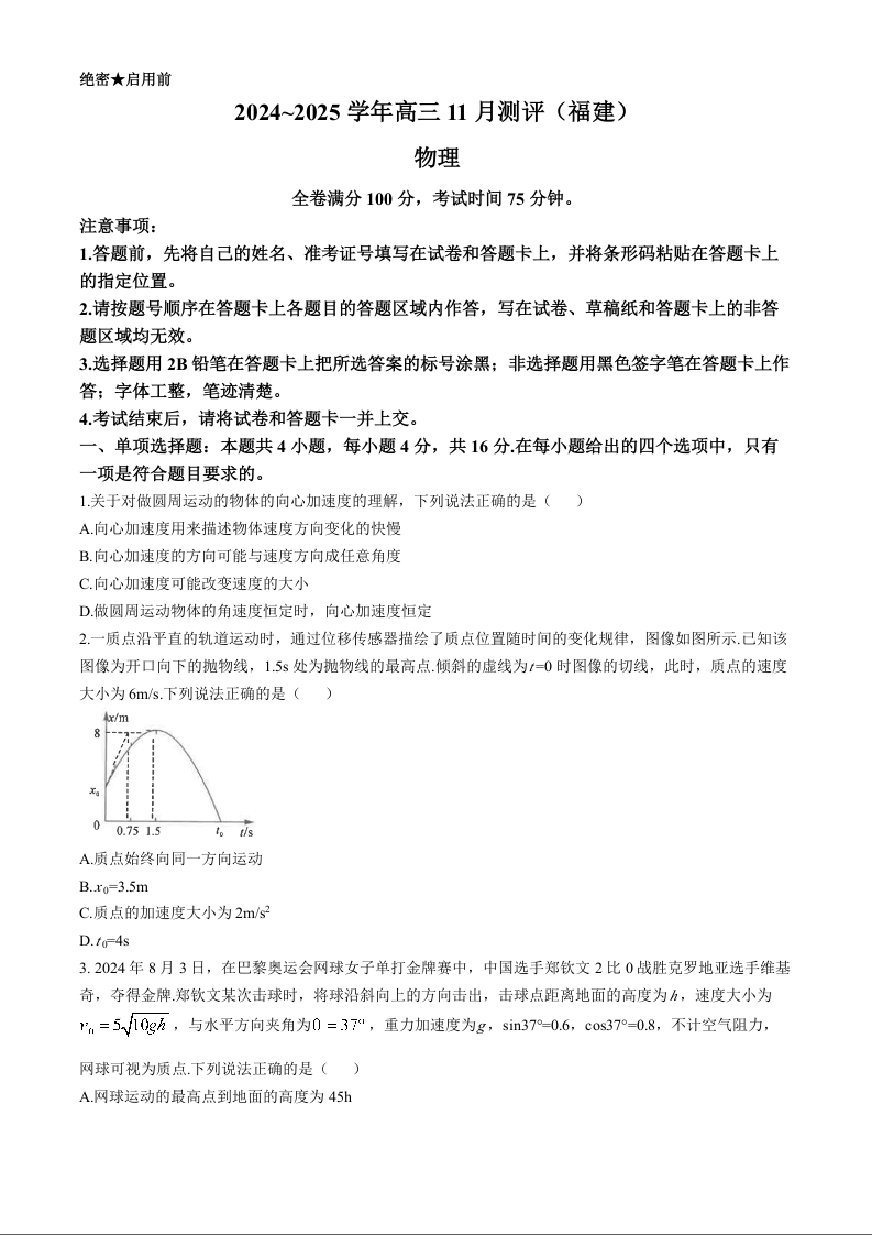 福建省2024-2025学年金科大联考高三11月测评物理及答案