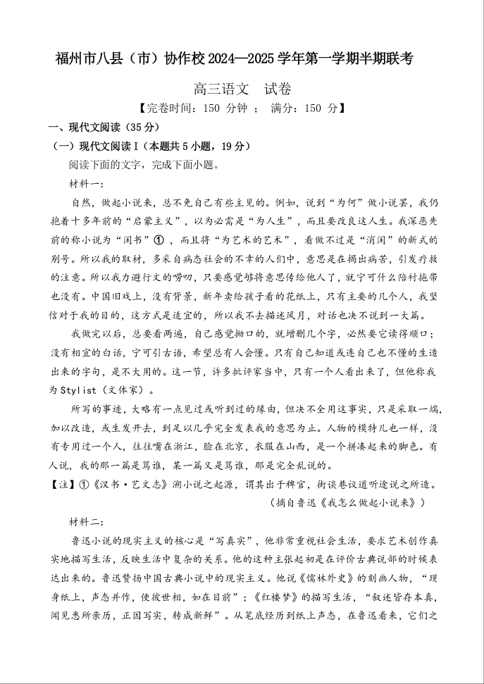 福建省福州市八县(市)协作校2024-2025学年高三上学期期中联考语文及答案