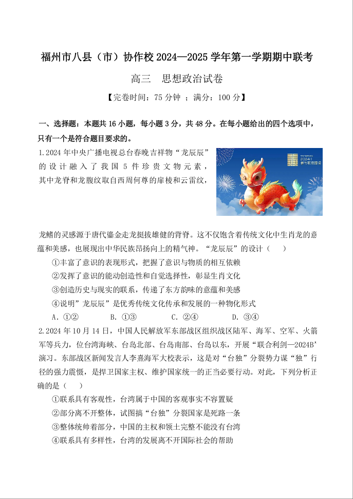 福建省福州市八县(市)协作校2024-2025学年高三上学期期中联考政治及答案