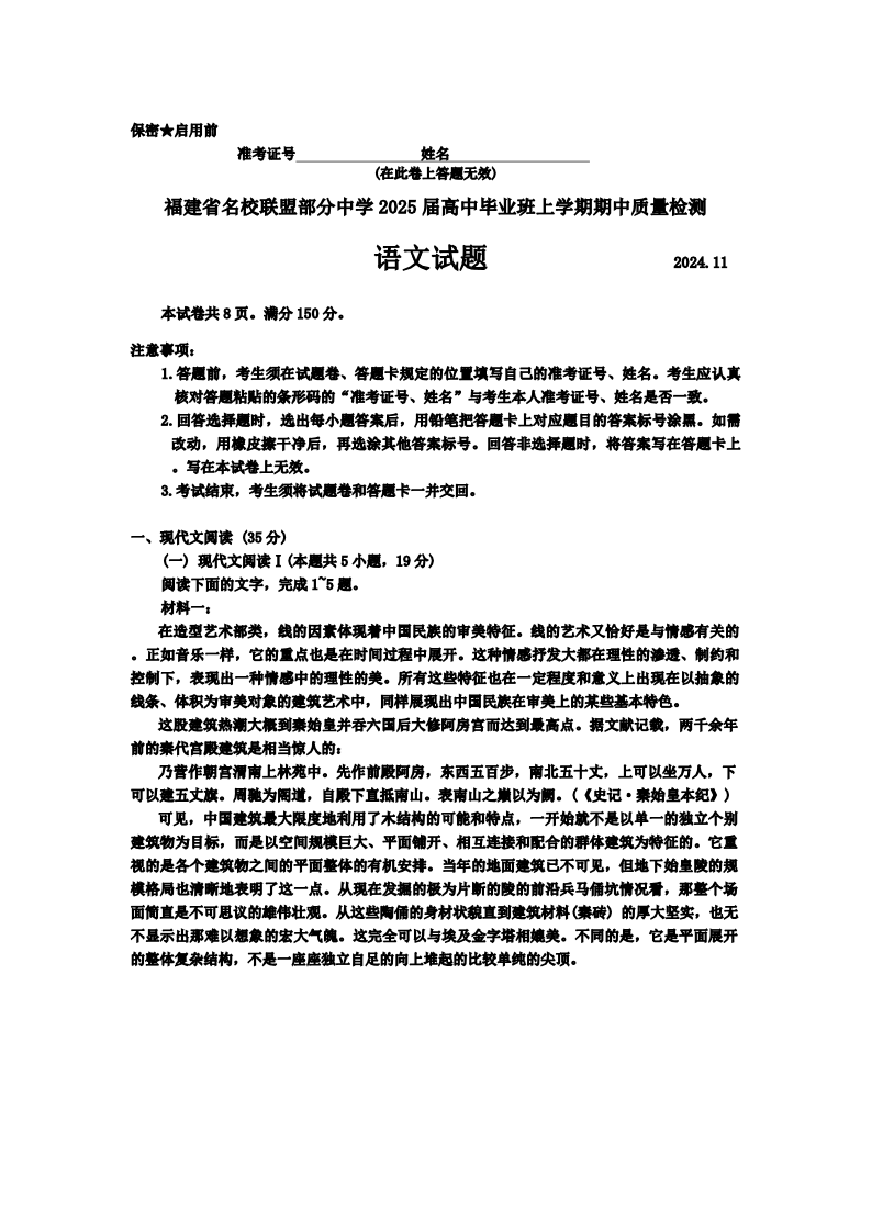 福建省名校联盟2025届高中毕业班上学期期中质量检测语文