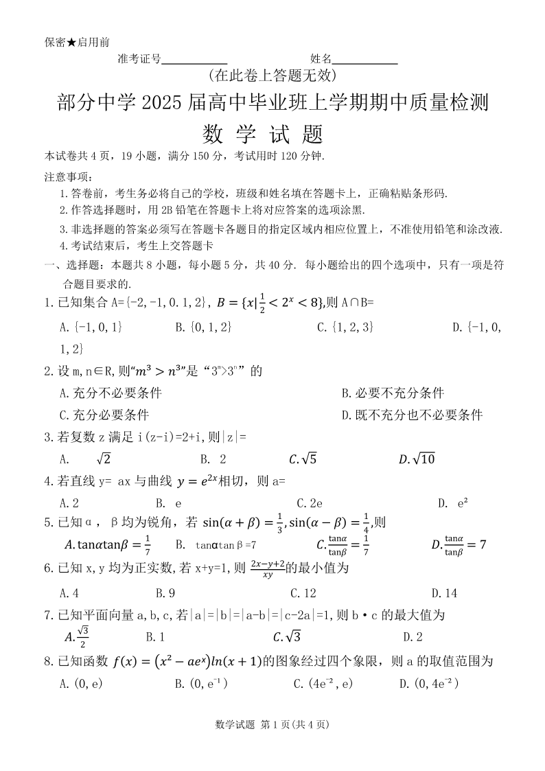 福建省名校联盟2025届高中毕业班上学期期中质量检测数学
