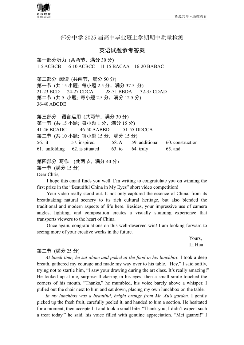 福建省名校联盟2025届高中毕业班上学期期中质量检测英语答案