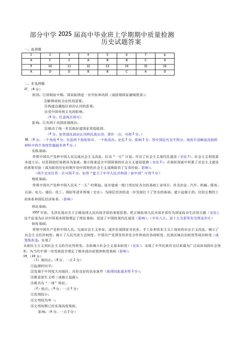 福建省名校联盟2025届高中毕业班上学期期中质量检测历史答案