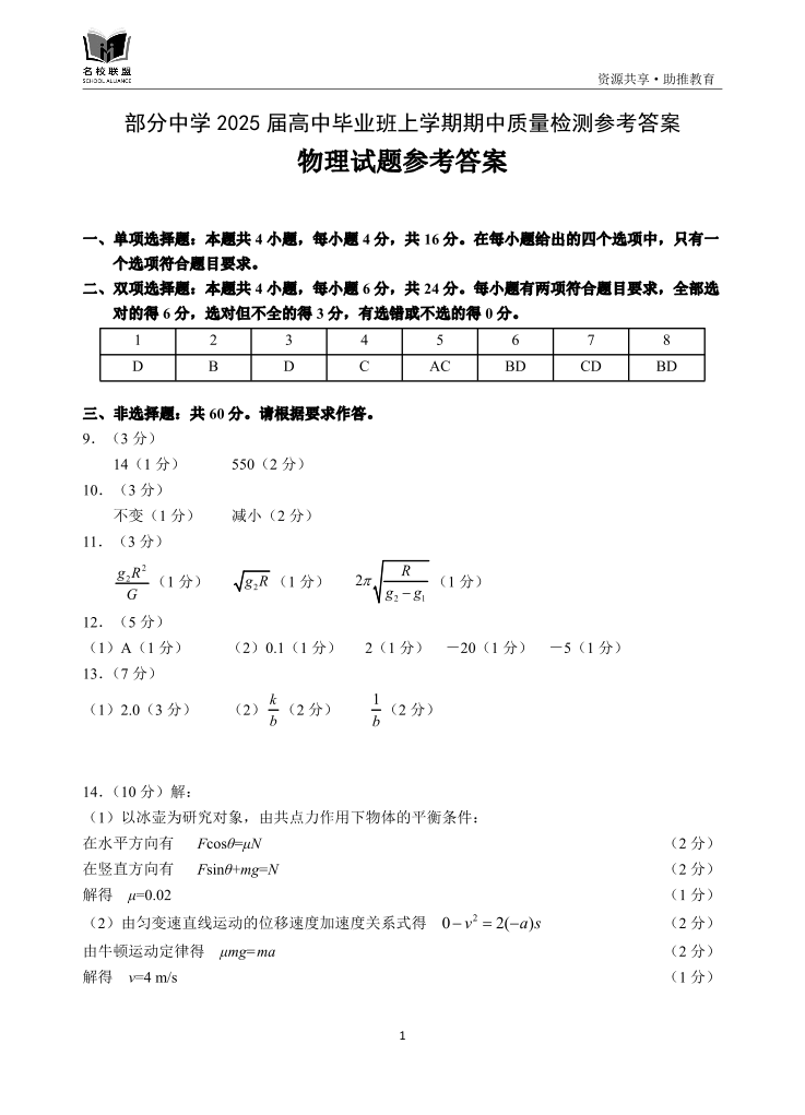 福建省名校联盟2025届高中毕业班上学期期中质量检测物理答案