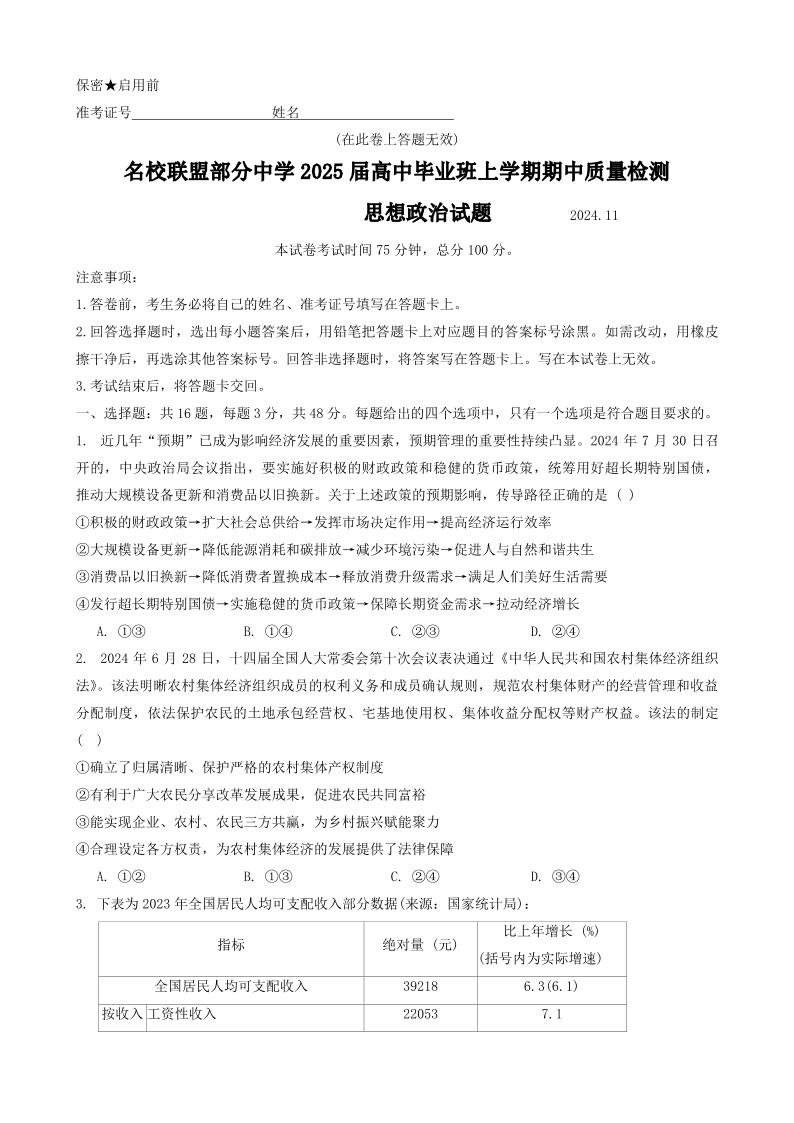 福建省名校联盟2025届高中毕业班上学期期中质量检测政治