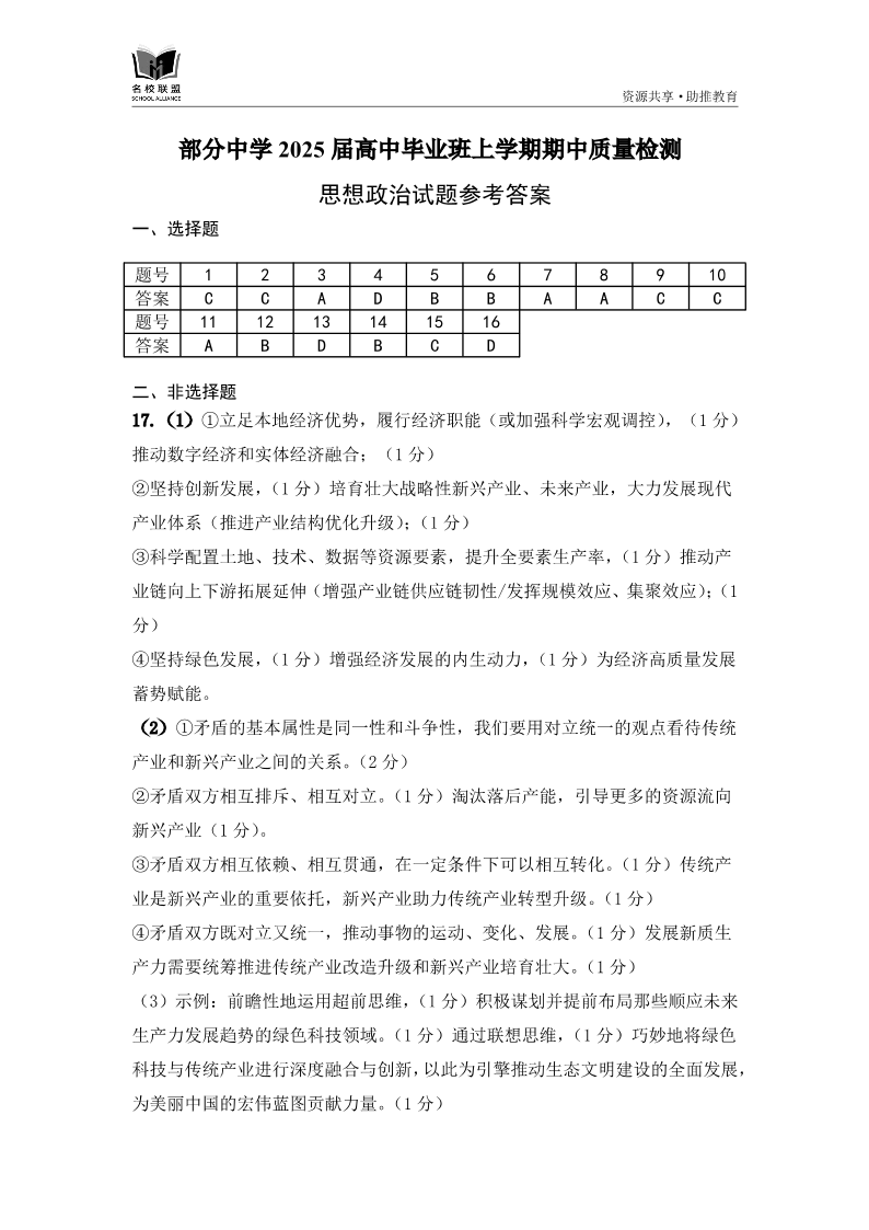 福建省名校联盟2025届高中毕业班上学期期中质量检测政治答案