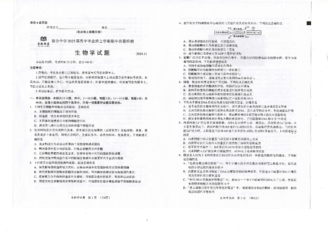 福建省名校联盟2025届高中毕业班上学期期中质量检测生物